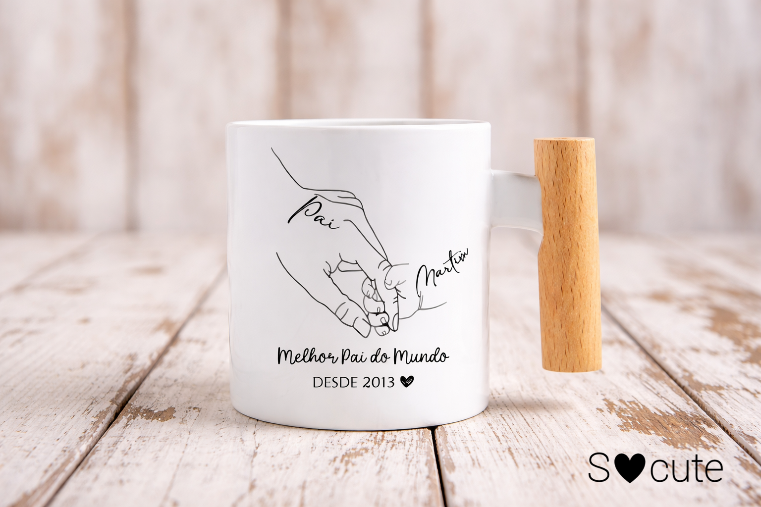Esta caneca personalizada para o Dia do Pai foi criada para celebrar o vínculo único entre pai e filho(a). Com ilustração minimalista de mãos dadas e possibilidade de personalização com nome e ano especial, transforma um gesto do dia a dia numa lembrança emocional para sempre.