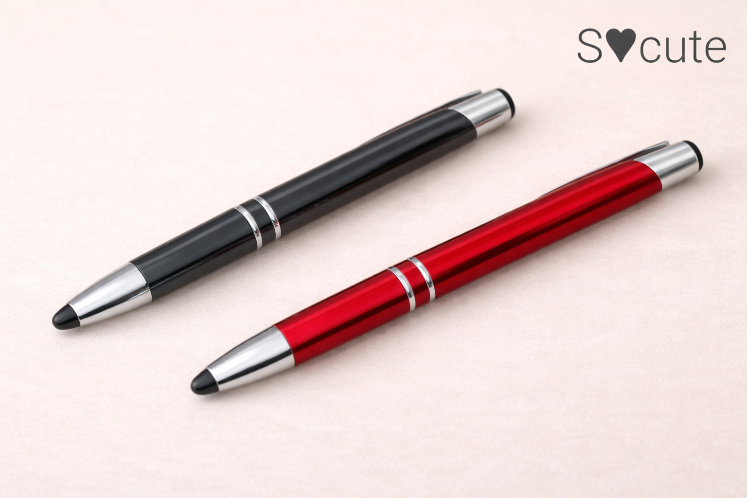 Disponível em duas cores (vermelho e cinza), com acabamento metálico moderno, gravação permanente a laser e ponta touch para ecrãs.