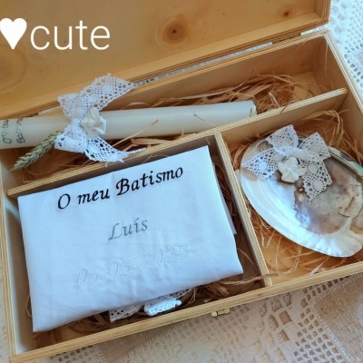 - Caixa de madeira pintada à mão com efeito minimalista, detalhe e laço em renda, com aplicação de anjo - 31,00€