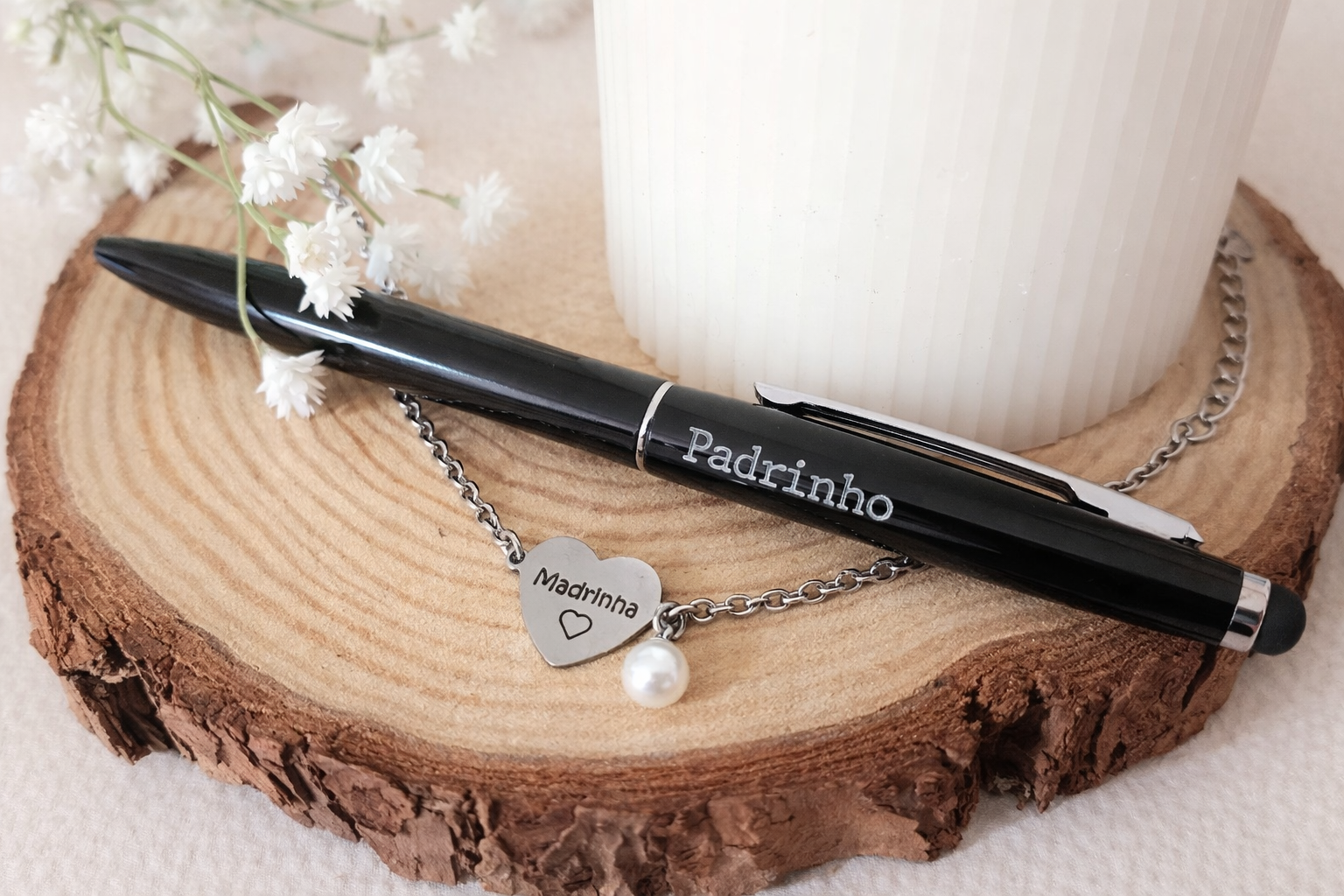 A elegante caneta gravada com “Padrinho” torna-se um presente útil e simbólico que pode acompanhar o padrinho no dia-a-dia.