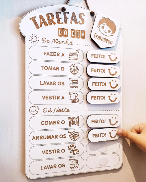Placa de tarefas para criança 22,00 € Desconto de %. Partilhar Compra este produto e ganha 66 Pontos! Saber mais Número de Crianças Uma Duas (acresce 2€) Três (acresce 4€) Número de tarefas Seis Oito Doze Personalização pretendida Comprar Contactar Placa Tarefas para crianças em Madeira, Para as Crianças criarem bons hábitos desde cedo! - As tarefas podem ser alteradas e adaptadas à rotina; - A placa pode levar até 12 tarefas. PRAZO DE PRODUÇÃO: 9 DIAS ÚTEIS Tags Tarefas criançasCrianças
