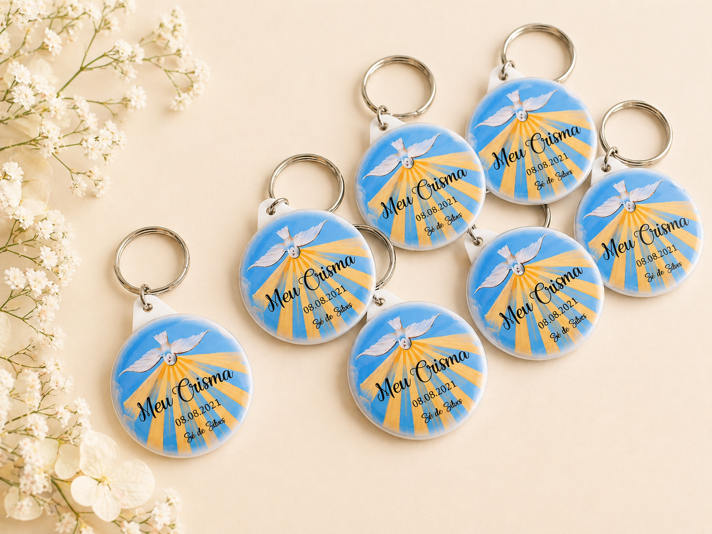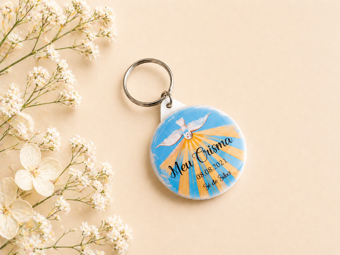 Este porta-chaves personalizado para Crisma é uma lembrança perfeita para oferecer aos convidados, com nome e data, tornando cada peça especial e significativa.