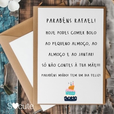 Postal de aniversário - Hoje podes comer bolo... 3,95 € Desconto de %. Partilhar Compra este produto e ganha 11 Pontos! Saber mais Personalização pretendida Comprar Contactar Postal de aniversário personalizado - pode pedir para alterar a mensagem * Impresso em cartolina branca 250gr* Envelope kraft incluído* Atrás pode escrever uma dedicatória/frase/data/ ou assinar apenas - Adicione um postal cheio de humor ao seu pedido e torne esse dia especial, único e divertido! Tags Postal aniversárioPostal com humorPostal divertido