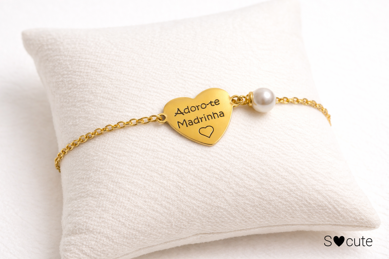 Com um pendente em forma de coração gravado com a mensagem “Adoro-te Madrinha”, e uma pérola que simboliza carinho e proteção, é uma peça pensada para ser usada todos os dias… e sentida para sempre.