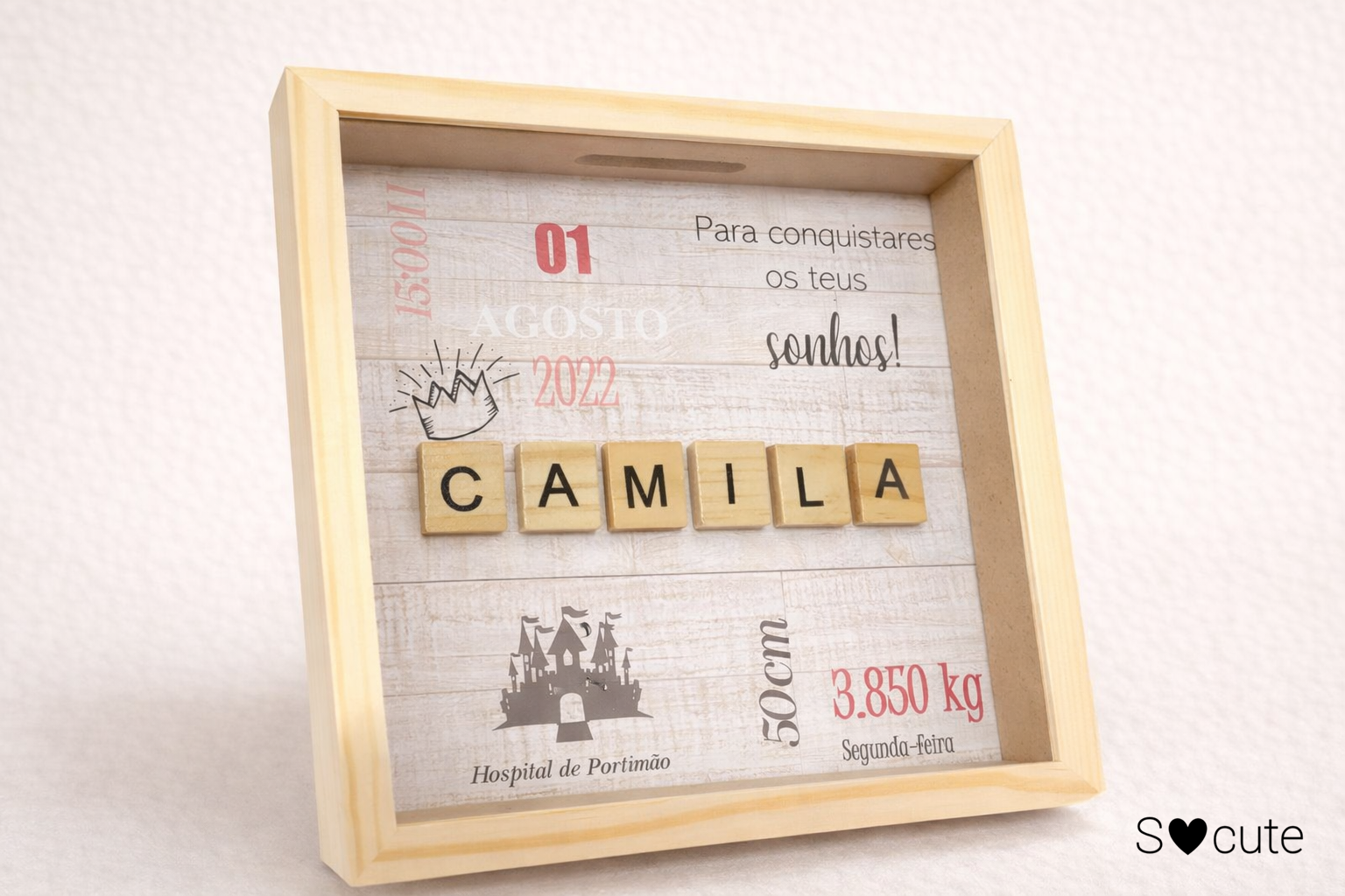 Este quadro mealheiro personalizado foi criado para eternizar esse dia único, com os dados de nascimento do bebé gravados de forma delicada e especial.