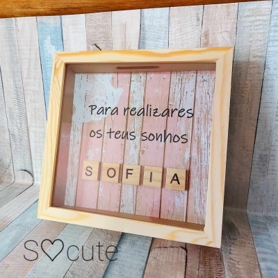 Quadro mealheiro personalizado 15,00 € Desconto de %. Partilhar Compra este produto e ganha 45 Pontos! Saber mais Comprar Contactar Quadro mealheiro personalizado com aplicação de letras em madeira em fundo rosa. Indique-nos o nome a colocar. O presente ideal que serve como peça decorativa.